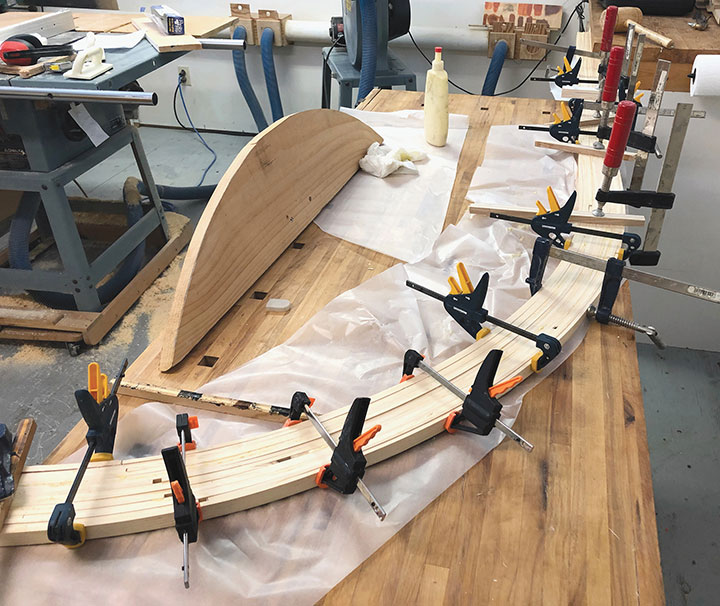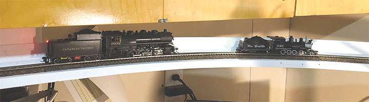 I wanted my test track to be pleasing and strong, so I decided to build it out of pine. The roadbed was made from laminated strips of pine like the roadbed I created for my Telluride branch (May/June 2014 Gazette). I made pine blocks for hanging the roadbed from the cupboards. Along the back of the test track, I added strips of Masonite so that a derailed locomotive couldn’t fall off the back and come crashing down on my workbench.