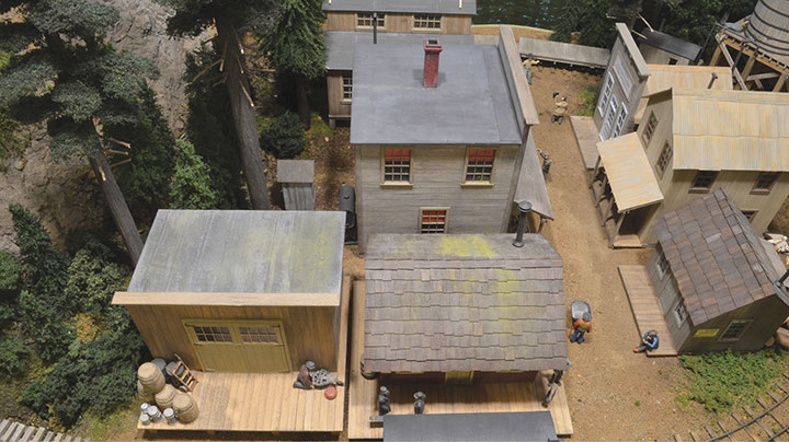 Construction of the structures began with a base of 0.060-inch-thick styrene on which an outer skin of individual wood boards were glued. I use an inner styrene base on all the structures to add stability and make them rigid. Grandt Line windows and doors were used along with whatever other details I could find. Roofing materials varied from tar paper, cedar shake and corrugated metal materials for an interesting look. Weathering of the buildings was done with an India ink and alcohol mixture along with some pastel/chalk pigments, and the odd bit of dry brushing.
