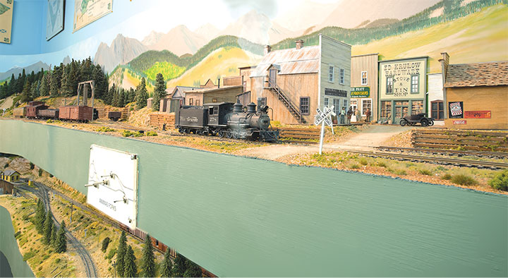 In building a double deck layout, I decided to keep the upper deck as narrow as possible, both to eliminate shadows and to avoid compromising the lower-level scenes. As a result, the top shelf varies between 8- and 12-inches, with Eureka being modelled in a corner to offer maximum space for track and structures. The SN also features prototypical 2, 3 and 4 percent grades resulting from elevation changes included in the design, with Albany at 43-inches the lowest point, and Animas Forks at 60-inches the highest point of the layout. Lighting is provided by fluorescent tubes and LED strips mounted under the upper deck.
