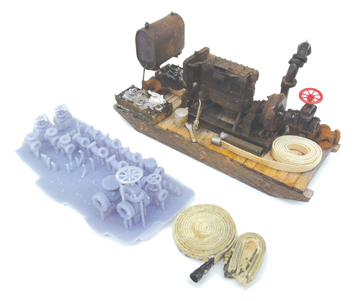 n-b-w castings. There is a white metal kerosene can, oil can and wrench, along with two epoxy coiled hoses and two toolboxes full of tools and gears. A strip of flat elastic material is also provided. You coil this around a pencil and ACC it. Then you can drape the hose around your model. A nice touch. There is even a little piece of tissue paper for oily rags. The kit also includes some extra strip wood to strew around and some styrene tube for pipes. A sheet of 3D pipe elbows and valves is also provided. I had 14 of these plumbing parts left over after detailing my pump and can use them for future projects. The idea is to assemble the pump and use it in a detailed diorama, so it has lots of details.