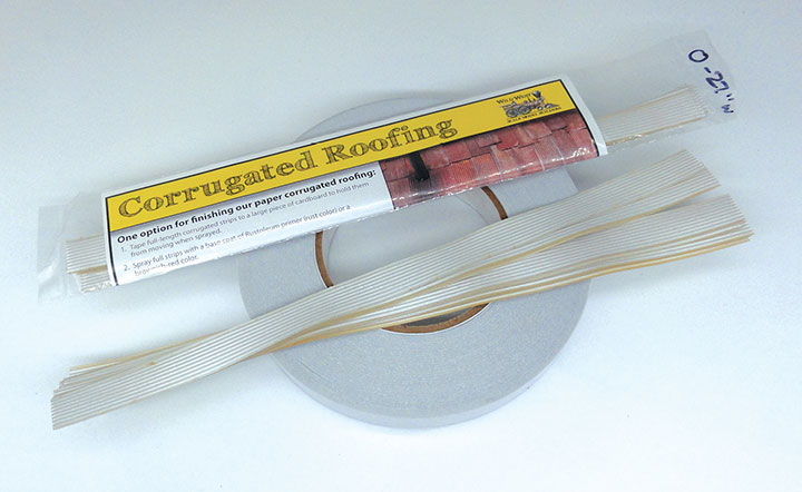 Wild West Scale Model Builders sells corrugated paper roofing. Way back in the late 50s Cliff Grandt used to hold a gathering of narrow gauge modelers every fourth Friday of the month. Cliff had a little corrugator that would make paper corrugated material. One Friday, I came equipped with strips of paper and spent the whole evening corrugating a lifetime supply of material. Well, not really, it soon ran out and I began using the corrugated paper sold by Russ Simpson. So, I love paper corrugated material. It is easy to cut, glue down, and paint will not flake off it. As my supply began to run out, I decided to try some of Wild West’s paper corrugated roofing. It comes in N, HO, S, and O scale. I bought some O scale material. Sixteen 11-inch long, 27-scale-inch wide strips sell for $10.00. The paper is a nice aluminum color, and one package covers some 30 scale feet. The strips come in a plastic sleeve with coloring and weathering instructions. I found the material nice and stiff so glue trails will not show through it. I am looking forward to using this corrugated on my next Bodie model.
