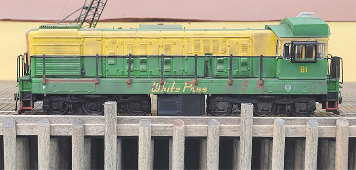 The prototype #81 wore the classic White Pass Rodeo Yellow and Alhambra Green paint scheme during its time in Alaska. Since Rob was modeling the locomotive as it appeared on the railroad, he painted his model in that scheme using Floquil BN Green and Reefer Yellow, lightened a touch with white. The decals were made by me to Rob’s specified height and printed by Draw Decals. Apple Barrel Brown Oxide craft paint and a tiny brush were used to paint the red primer in the approximate pattern the real #81 had after the White Pass added the wider walkways and long hood handrails. Rob weathered his model with Pan Pastel powders using photos of the prototype as a guide.