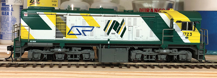 The Wuiske 1720 class is very easy to regauge to HOn3. To do so, first remove the gearbox cover plate from each truck with the six clips molded onto the plate. Cut off the lip on the outside of the plate with a sharp blade, leaving the side clips to reinstall the cover plate. Using a razor saw to cut vertically next to these clips makes quick work of this. Then remove the wheelsets and press each wheel further in on its axle. Using a piece of steel and a small ball peen hammer, the wheels can be tapped in on the axles, but be careful that the wheel only moves about 0.030-inch in and stays true to the axle. Check the gauge with an NMRA standards gauge. Reinstall wheelsets, snap the cover plates back on and test run. On Rob’s, the wheels were pushed slightly more to one side to replicate the slight “off-balance” look of the prototype.
