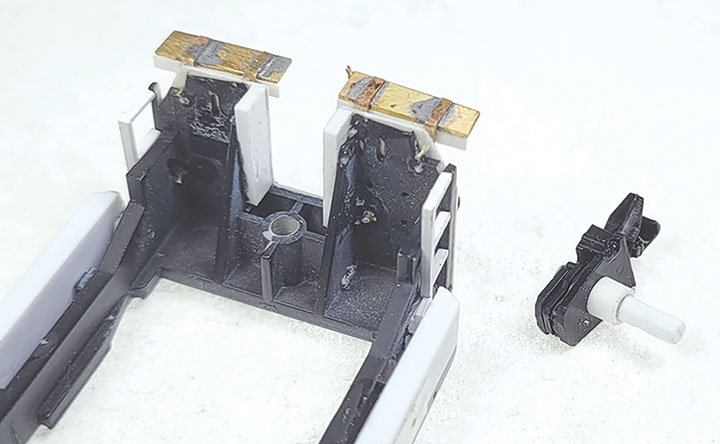The prototype could have the couplers mounted at several heights from 22½ up to 36-inches, and the model needed a better way to simulate the space above and below the prototype’s coupler. Rob came up with a method that effectively simulates this. First the coupler mounting screw holes were drilled out on the locomotive frame with a #46 (0.080-inch) drill bit. Next, Rob bored out a piece of 0.125-inch (1/8”) styrene tube to a depth of about .25-inch with the same #46 (0.080-inch) drill bit and then cut the tube into two lengths of about 0.090-inch each. Then cut two approximately .25-inch lengths of 0.080-inch diameter styrene rod, and glued one of these into each tube; making a pair of what looked like “Battleship” game pegs. A #56 hole was carefully drilled in the center of the large end of each “peg” for a Kadee 714 mounting screw, or you could drill and tap for an 0-80 machine screw. The small end needs to be carefully sanded or filed just a little so that it fits snugly but is removable because the height of the big end may need to be adjusted. With the locomotive reassembled and on the track, the coupler height can be checked and adjusted as needed by trimming the large end of the peg. This took three or four tries and only ended up messing up one peg that required starting over! The Kadee 714 HOn3 couplers were then installed, but still needed to have the rear portion of their boxes trimmed off to clear the locomotive’s trucks.