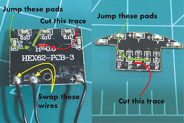 The model’s lights are all LEDs mounted to two circuit boards, one in the roof of the cab and the other at the end of the long hood. There are individual LEDs for the four class lights, four number boards, and the headlight and backup light. All of them looked too yellow, so on both of our models they were replaced with golden white LEDs of the same size. The factory wiring was also a little odd to us as the headlight/backup light function would also illuminate the class lights on that end of the locomotive, but there was a separate decoder function for the number boards. With a few cut traces on the circuit boards and the addition of a few jumper wires we got that changed around so that the number boards illuminated with the headlights and all four class lights were now together on another function. Each board required swapping the two function wires, a simple task. The slightly more challenging change was the traces. The long hood board required the trace below the headlight LED to be cut with a sharp knife. Then a jumper wire was soldered in place from the hole in the board by the “H” to the left side of the headlight LED. On the cab board, the trace below the backup light was cut and the bottom of the three center LEDs were jumpered together. Like the long hood board, the two function wires had to be swapped as well.