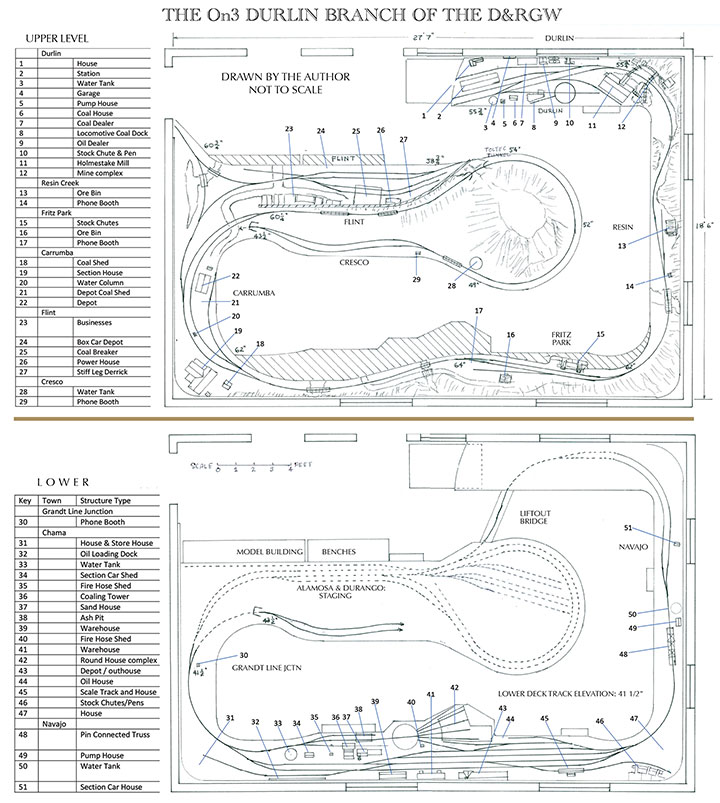 If the entire length of a peninsula down the middle of the room were used for an out and back climb to the second deck, the 181/2-inch elevation gain needed to clear the top of the coaling tower in Chama could be accomplished with a 3.8 percent grade. And the need for helpers would be real. By keeping the grade after the end of the peninsula turn back loop fairly close horizontally to the lower part of the grade, half the width of the peninsula could be used for staging on the lower level, while half of the upper level could be the end of the second branch line. With the general routing of the main line set, the sidings, on-line spurs and a few prototype scenes could be planned.
