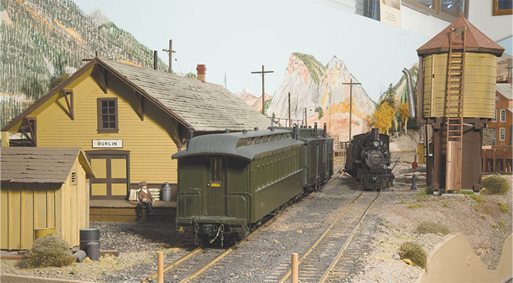The first siding was located on the lower part of the grade with space provided at the upper end of the siding for modeling of the east end of Cresco siding with its phone booth, station sign, wood pile trestle and water tank. Cumbres would be at the top of the 3.8 percent grade, but the trackage did not fit. Cumbres became Carrumba with a long passing siding, a spur, a wye tied into the siding and structures from Cumbres. Fritz Park is the named place of a third siding and a spur located between Durlin and Carrumba. It is the real top of the hill as the main climbs on a 1.5 percent grade out of Carrumba and then descends on a 4 percent grade from Fritz Park to Durlin. The fourth passing siding is Navajo on the lower deck between Chama and Durango staging. The east end of Navajo is visible and includes the station sign, car body shed, water tank, pump house and pin-connected through truss bridge.