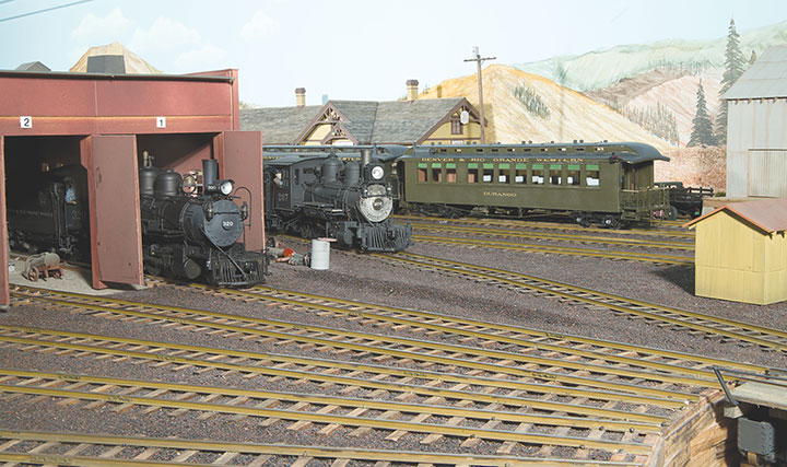 The DC sound days showed steam sound to cause people to run at lower speeds, which on a track length impaired layout is really a good thing. To extend the run over the road, all the water stops ended up with spout animation and tank fill sound which runs a pre-determined amount of time. Crews no longer blow by water stops. Sound modules are also used to time individual stock car loading at Fritz Park and Durlin. A sound clip recorded years ago, when a locomotive was loaded with coal from the Chama tower on the Cumbres & Toltec Scenic RR, is in a sound module and playback times the coal loading event in ¼-inch scale. LEDs with fiber optics put on a light show simulating cleaning a locomotives fire over the Chama ashpit. All are fun work for the crews, and lengthen the time of a trip.