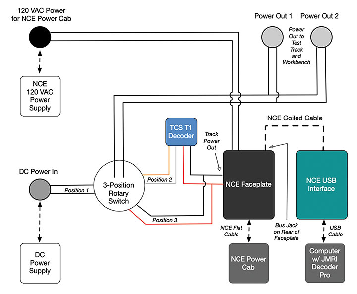 4.I use a dedicated NCE Power Cab, NCE USB interface, JMRI and my computer to program Decoders. The new test track was going to need to support these devices without having a jumble of wires all over my workbench.