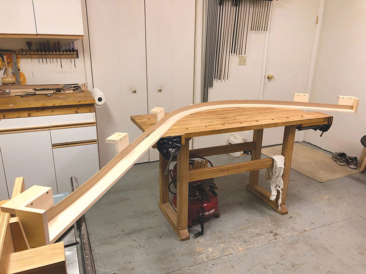 I wanted my test track to be pleasing and strong, so I decided to build it out of pine. The roadbed was made from laminated strips of pine like the roadbed I created for my Telluride branch (May/June 2014 Gazette). I made pine blocks for hanging the roadbed from the cupboards. Along the back of the test track, I added strips of Masonite so that a derailed locomotive couldn’t fall off the back and come crashing down on my workbench.
