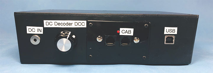 Looking from left to right across the front of the box (bottom of photo): There is a female plug used for a DC input from a DC power supply. This is wired directly to the rotary switch beside it. The rotary switch is used to control the power to the two output sockets. The options are DC power, DCC Decoder power or straight DCC track power. Next, the NCE faceplate takes its power from the power adapter input from the back of the box, and sends a DCC signal to the Decoder and straight to the rotary switch. The last component is the NCE USB adaptor board. The USB board’s supplied coiled wire is stuffed in the box and plugged into the back of the NCE faceplate.
