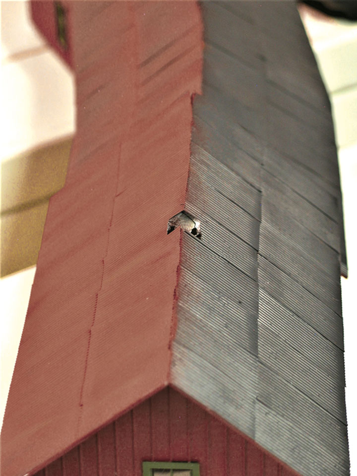 I had purchased a variety of Pan Pastel colors I thought would work for weathering, but hadn’t used them very much. I tried them on a few painted corrugated test strips and liked the results. I wanted the look of a normally weathered roof rather than a decrepit one. I applied the powder with small brushes rather than the soft sponges the manufacturer recommends.