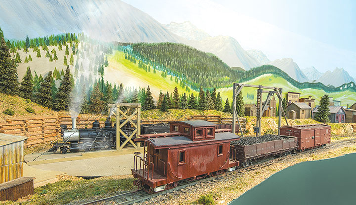 In building a double deck layout, I decided to keep the upper deck as narrow as possible, both to eliminate shadows and to avoid compromising the lower-level scenes. As a result, the top shelf varies between 8- and 12-inches, with Eureka being modelled in a corner to offer maximum space for track and structures. The SN also features prototypical 2, 3 and 4 percent grades resulting from elevation changes included in the design, with Albany at 43-inches the lowest point, and Animas Forks at 60-inches the highest point of the layout. Lighting is provided by fluorescent tubes and LED strips mounted under the upper deck.
