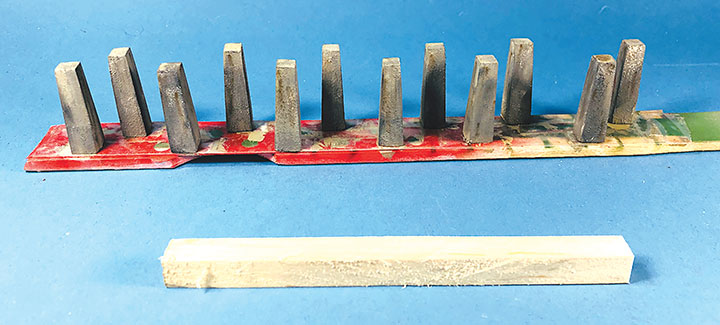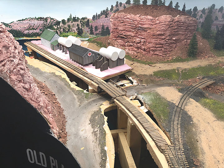 I built the entire petroleum spur at my workbench, including the scenery. This diorama replaced an existing spur on my layout and was blended into the basic scenery. With the Conoco distributor in place, I now have a destination for my San Juan Models tank cars. The Texaco dealership provides me with a destination for my CYCX numbered narrow frame tanks as well as my double dome TCX tanks. The people of Placerville and the adjoining Paradox Valley will be well served for their petroleum needs.Initially I tried making the tanks using a styrene sheet wrapped around styrene disks, but all I managed to accomplish was to create a badly dented tank that looked like it was being crushed in a junk yard. That failure sent me back to the drawing board. After some thought, I took a trip to the local home improvement store and bought a length of 1¼-inch diameter plastic conduit. The outer diameter worked out almost perfectly to the 12 feet indicated on the Mike Blazek drawings (www.blazekplan.com) that I was using as a guide. I cut five pieces of conduit to 27 scale feet in length, then capped the ends with .020-inch styrene. I used Tamiya cement which seemed to work just fine with the plastic that the conduit was made from. The caps were trimmed to size and filed to create a smooth union. This photo illustrates the steps involved.Most prototype tanks constructed in the early 1900s were made by riveting a number of rolled steel sheets together. To simulate the center section of sheets I wrapped a 13½-scale-foot wide piece of .010-inch styrene around the tanks. More Tamiya glue and rubber bands held the styrene in place.The three Texaco tanks sat on top of poured concrete saddles. I used 5/16-inch plywood to simulate these saddles. The first step was to cut the plywood into strips that were a scale 12-feet wide. I then drilled 1 5/8-inch holes about three real inches apart. Then I cut through the middle of each hole creating a bunch of blocks of wood with a half a circle cut out of each end. These were then used to create saddles ten scale feet in height. When I was done, I had a pile of concrete saddle forms. I selected the best-looking ones and grouped them in sets of three saddles for each of the three Texaco tanks. The wood was then sanded smooth, and I ended up with basic forms that were used to simulate the real concrete saddles.The three sets of Texaco tank saddles were painted a base coat of Floquil Concrete. To create texture and make the wood blocks look more like concrete, I rubbed on three shades of gray Pan Pastels that ranged from an almost white tone to a medium gray. I then used an earth-colored Pan Pastel and various rust colors to add streaks to the concrete saddles. When I was satisfied with the look, I sprayed them with Testors Dullcote.With the Texaco tank saddles sorted out, I focused on finishing the tanks. I felt they needed more detail, so I used Archer textured rivets decals (AR 88098 & AR 88031) to simulate the seams in the tank pieces. I also added a row on the tank ends to simulate two pieces of metal making up the ends. These rivet decals were tricky to apply to a cylinder until I used some left-over tank saddles taped to a plastic box as a cradle. This setup made it much easier to apply the decals.I made the Texaco and Conoco tanks identical. There is one photo in the RGS Story Vol. 1 (Sundance Publications) that shows the Conoco tanks in the background, and they appear to be about the same size as the Texaco tanks. This made construction a lot easier. With all the Archer decals applied, I had all five tanks ready for paint. I ended up painting them Floquil Reefer White shortly after this photo was taken.In the RGS Story Vol. 1, if you look closely at the photos of the left-over tank bases for the Conoco facility, you’ll see tapered concrete pedestals. To create these pedestals, I used my table saw to cut basswood 3-scale-feet square. I cut this wood into 10-scale-foot lengths. Placing a 2-foot-square mask over the end of each pedestal blank, I traced a 6-scale-inch outline on the perimeter of the end of the wood blocks. Using a belt sander clamped in my workbench vice, I sanded the four sides to a taper using the 6-inch mask as my guide for making one end 2-feet square while leaving the other end 3-feet square. When I finished making these pedestal blanks, I painted and weathered them using the same technique as I did for the Texaco tank saddles.The prototype photos only show the Conoco concrete tank pedestals but don’t show any details of what the tanks sat on. Since there is no sign of steel bracing in the photos, I felt that there was probably some sort of wooden frame between the pedestals and the tank. Using 8- x 16-inch scale lumber, I created large cradles like what you’d see on a Conoco tank car. These cradles were stained with Hunterline Driftwood and Medium Brown stain. On the prototype, the cradles would have needed to be fastened to the pedestals. To simulate that, I made metal plates using 1- x 10-inch styrene with Grandt Line #5123 NBW castings to make it appear like the cradles are lag bolted to the tops of the concrete pedestals. I weathered these cradles with rust colored Pan Pastels.With the basic structures built, I wanted to see how they would fit on the existing Old Placerville vspur on my layout. I didn’t bother with the tanks, but set the other structures in place while leaving room for the tanks. I wanted to get a sense for how everything would fit into the scene, verify the elevations, and see if I could utilize the existing spur trackage. It was apparent that space was going to be tight, and the spur would need to be moved to make room for all the buildings.With the general position of where the petroleum distributors would fit into my Old Placerville scene decided, I did one more re-check of the scene with the buildings in place. I also used pieces of flextrack to determine where the spur would be aligned. Once the buildings were in