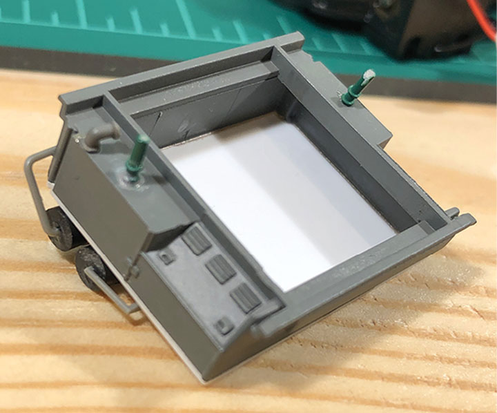 The Wuiske 1720 class is very easy to regauge to HOn3. To do so, first remove the gearbox cover plate from each truck with the six clips molded onto the plate. Cut off the lip on the outside of the plate with a sharp blade, leaving the side clips to reinstall the cover plate. Using a razor saw to cut vertically next to these clips makes quick work of this. Then remove the wheelsets and press each wheel further in on its axle. Using a piece of steel and a small ball peen hammer, the wheels can be tapped in on the axles, but be careful that the wheel only moves about 0.030-inch in and stays true to the axle. Check the gauge with an NMRA standards gauge. Reinstall wheelsets, snap the cover plates back on and test run. On Rob’s, the wheels were pushed slightly more to one side to replicate the slight “off-balance” look of the prototype.